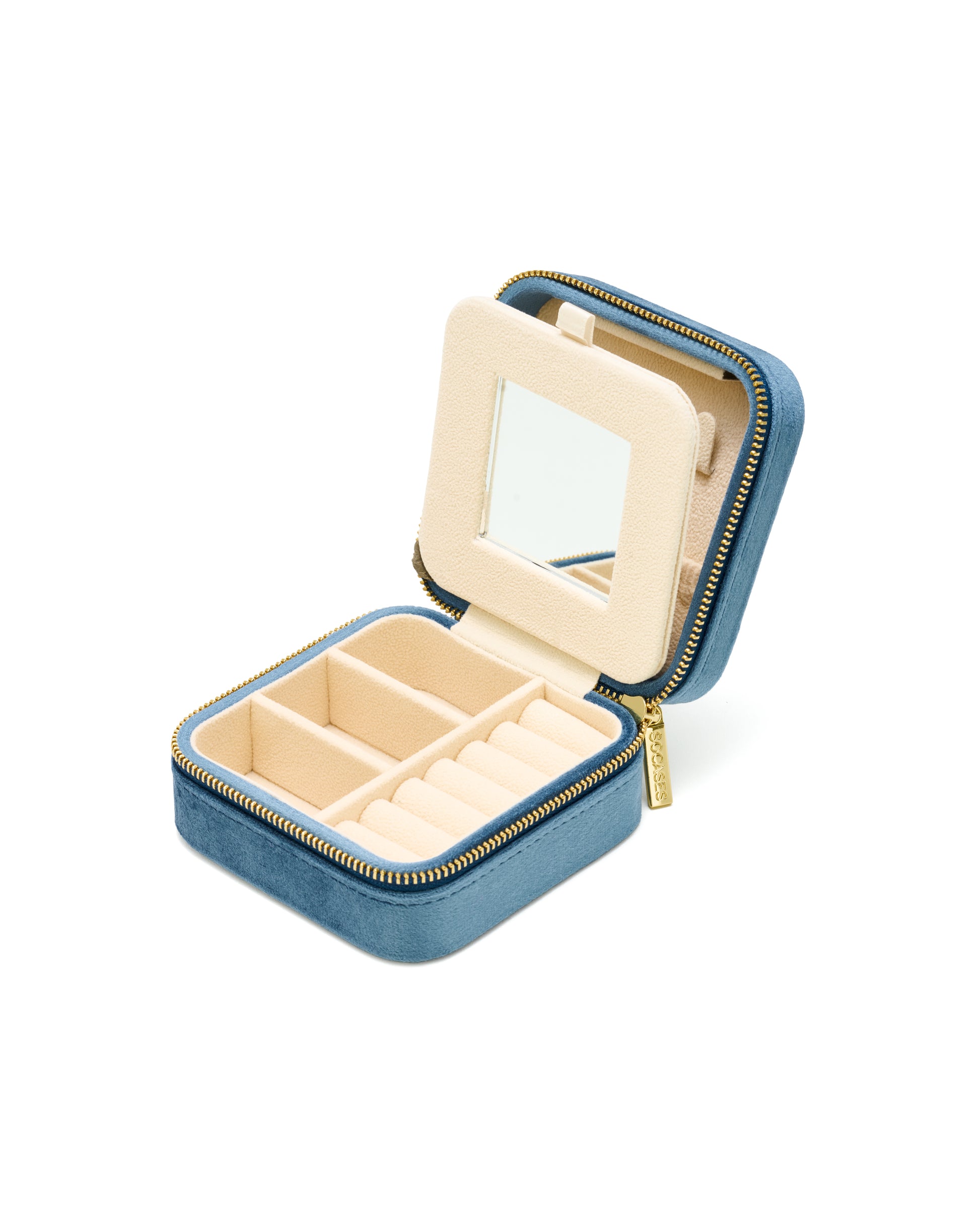 Die Samt Schmuckkästchen von SOCASES gibt es immer wieder in verschiedenen Farben – stets mit goldfarbenem Zipper und einem Innenleben in beige. Der edle Samtbezug ist nicht nur ein echter Handschmeichler, sondern auch äußerst hochwertig und robust. Wunderschön für zu Hause auf deiner Kommode oder dem Schminktisch und perfekt für die Reise. Das Schmuckkästchen kann 3 Halsketten, 6 Ringe oder kleine Ohrringe, 3 Armbänder, Uhren oder größere Ohrringe optimal organisiert aufbewahren. Der integrierte Spiegel ist besonders nützlich, um beim Reisen Schmuck perfekt anlegen zu können. Edles Design trifft Funktionalität – dein Schmuck ist auch on-the-go geschützt vor Kratzern oder dem typischen „Verknoten“ von Halsketten.